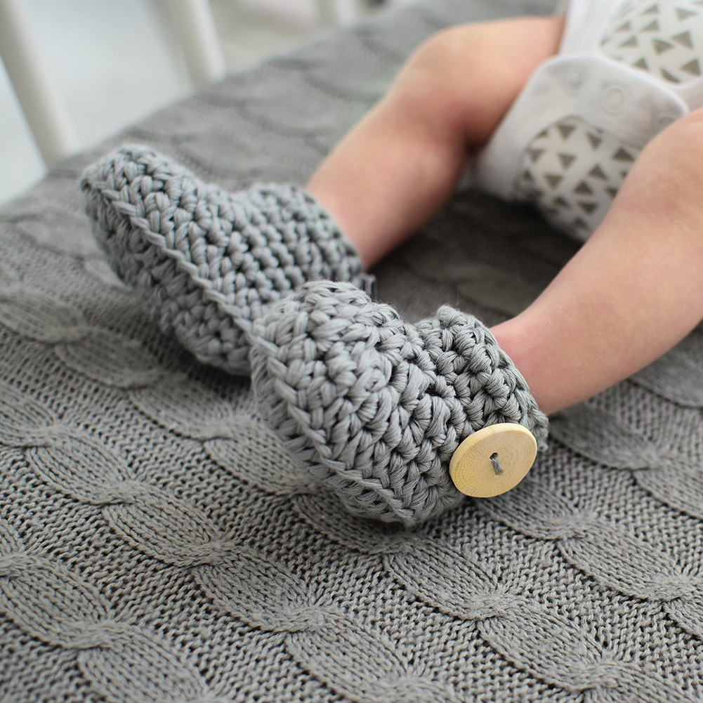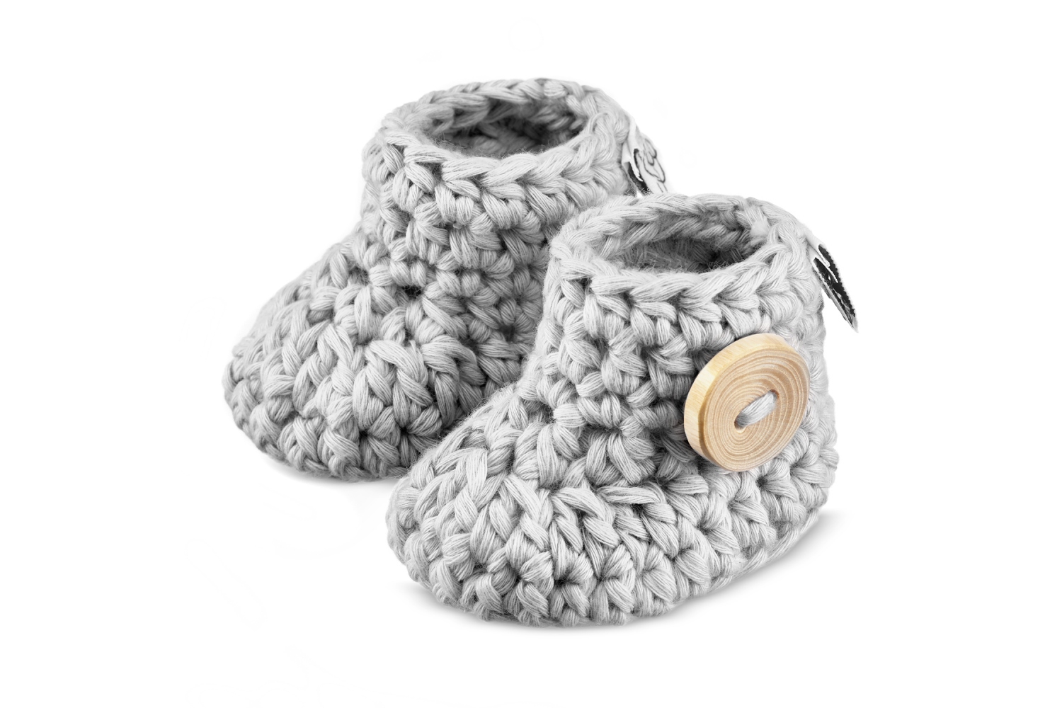 Handgemachte Baby Booties mit Knopf für einen süssen Look. Wärmend und weich für die allerkleinsten Füsschen. Hypoallergenes Material, antibakteriell.