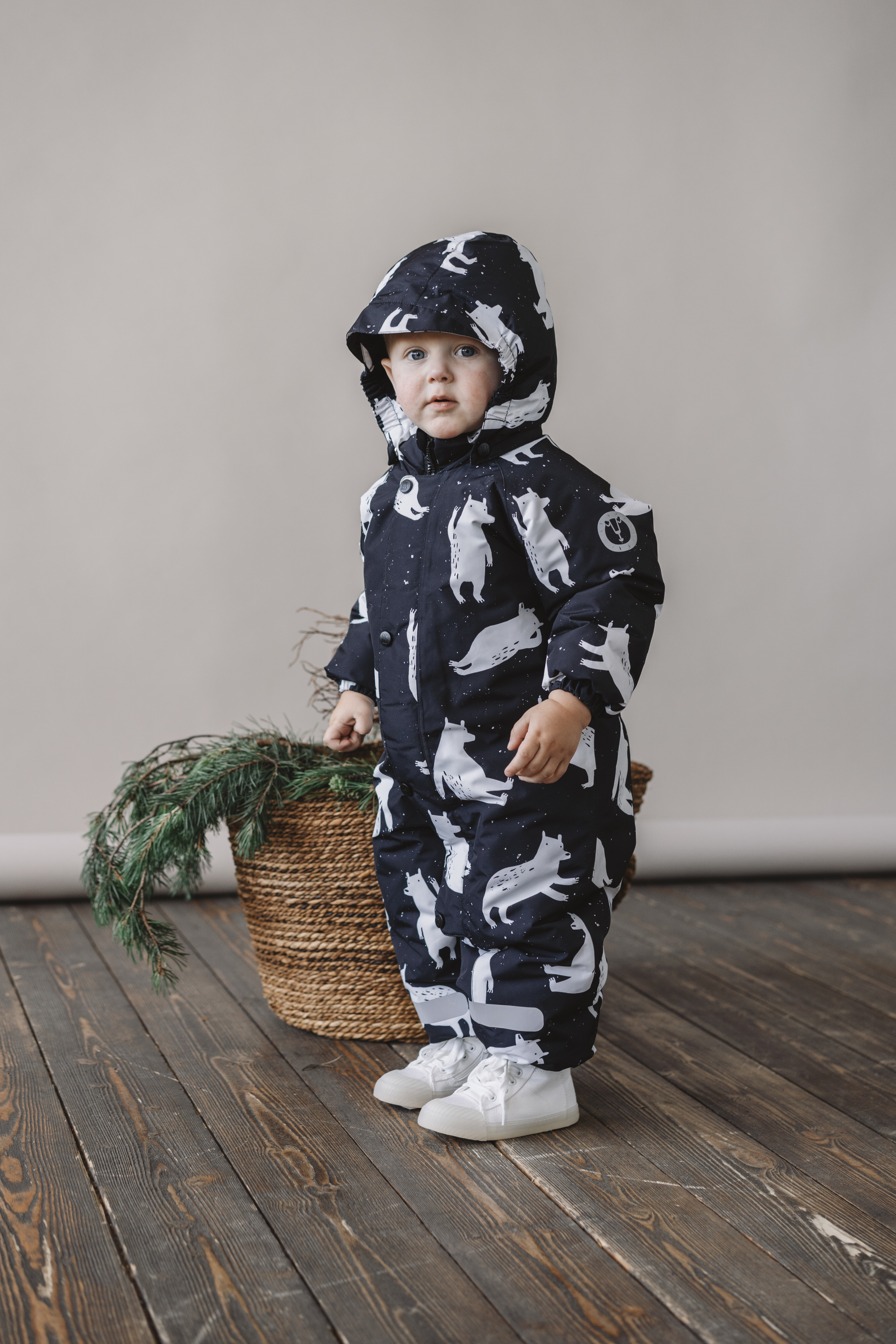 Wasserabstoßende Nähte. Glattes Innenfutter. Elastische Manschetten an den Ärmeln und Hosenbeinen. Abnehmbare verstellbare elastische Gummibänder, die es ermöglichen, das Overall an den Schuhen des Kindes zu befestigen. Abnehmbare Kapuze auf Knöpfen. Ein paar reflektierende Elemente. Etikett auf dem Rücken zur Angabe des Namens des Babys.