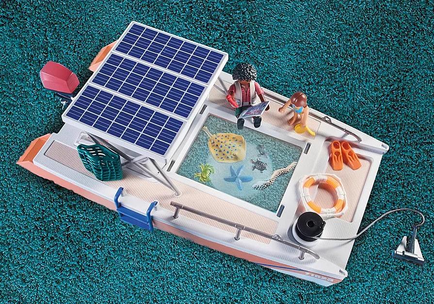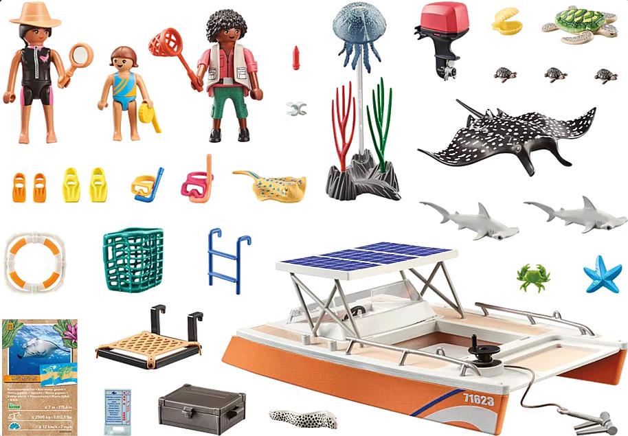 Figuren: 1 Frau mit Taucherausrüstung, 1 Mädchen mit Taucherausrüstung, 1 Mann; Tiere: 1 Qualle (schwimmend, auf Stab befestigt), 1 Mantarochen, 1 Stachelrochen, 2 Hammerhaibabies, 1 Seestern, 1 Krebs, 1 Meeresschildkröte, 3 Schildkrötenbabies, 1 Muräne; Zubehör: 1 Katamaran mit Solardach und mittig transparentem Glasboden mit Lupenfunktion, 1 Anker, 1 Außenleiter, 1 Ausleger mit Netz, 1 Heckmotor, 1 Koffer mit diversen Utensilien