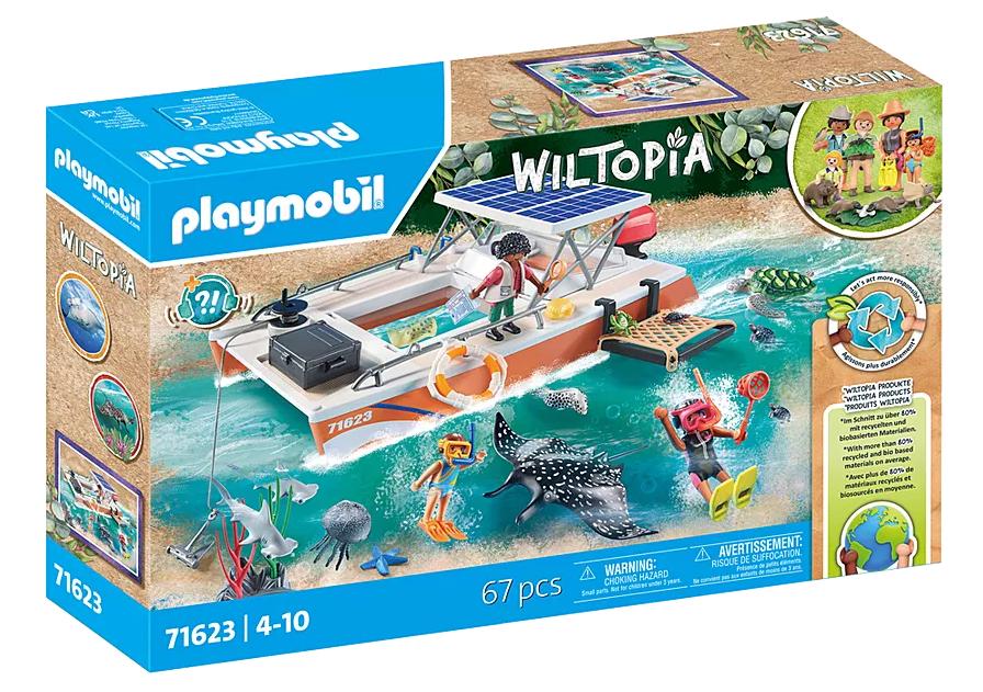 Das australische Great Barrier-Korallenriff besteht aus einer zusammenhängenden Ansammlung von über 2900 einzelnen Korallenriffen und ist damit das größte der Erde. Das Naturwunder bietet Lebensraum für eine Vielzahl von Arten, die sich vom schwimmfähigen Elektroboot mit Solardach aus beobachten lassen: zwei junge Hammerhaie, zwei Rochen, eine Qualle und sogar eine Meeresschildkröte mit ihren Jungen schwimmen neben vielen anderen Meerestieren am transparenten Boden des Boots mit Lupenfunktion vorbei. Mit Tauchausrüstung, Forscher-Equipment und viel Zubehör. Die nachhaltige PLAYMOBL-Spielwelt Wiltopia nimmt Kinder mit in heimische und exotische Regionen unserer Erde und bringt ihnen auf spielerische Weise die Schönheit und Zerbrechlichkeit unserer Welt und ihres Ökosystems näher. Alle Spielsets dieser Produktreihe bestehen im Schnitt zu über 80 % aus recyceltem und bio-basiertem Material.