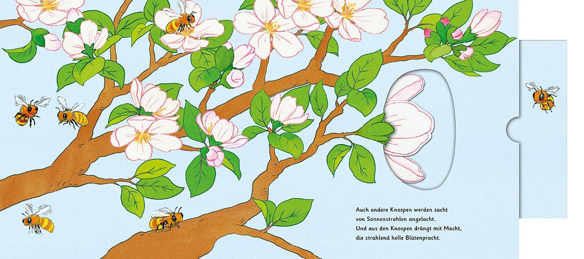 Im Winter ein kahler Baum, zarte Knospen und Blüten im Frühling, dann eine kleine grüne Frucht, endlich ein praller, roter Apfel. Dieses Naturwunder wird in naturgetreuen Bildern und mit meisterhafter Papierfalttechnik in ein zauberhaftes Buch gebannt. Mit ausgeklügelten Schiebern und Klappen kann die Sonne den Schnee schmelzen lassen, die Blüten öffnen sich und aus dem Fruchtknoten wächst ein prächtiger Apfel heran. Ein Kunstwerk, das Kinder und Erwachsene zum Staunen bringt und für alle Naturliebhaber das richtige Geschenk ist.