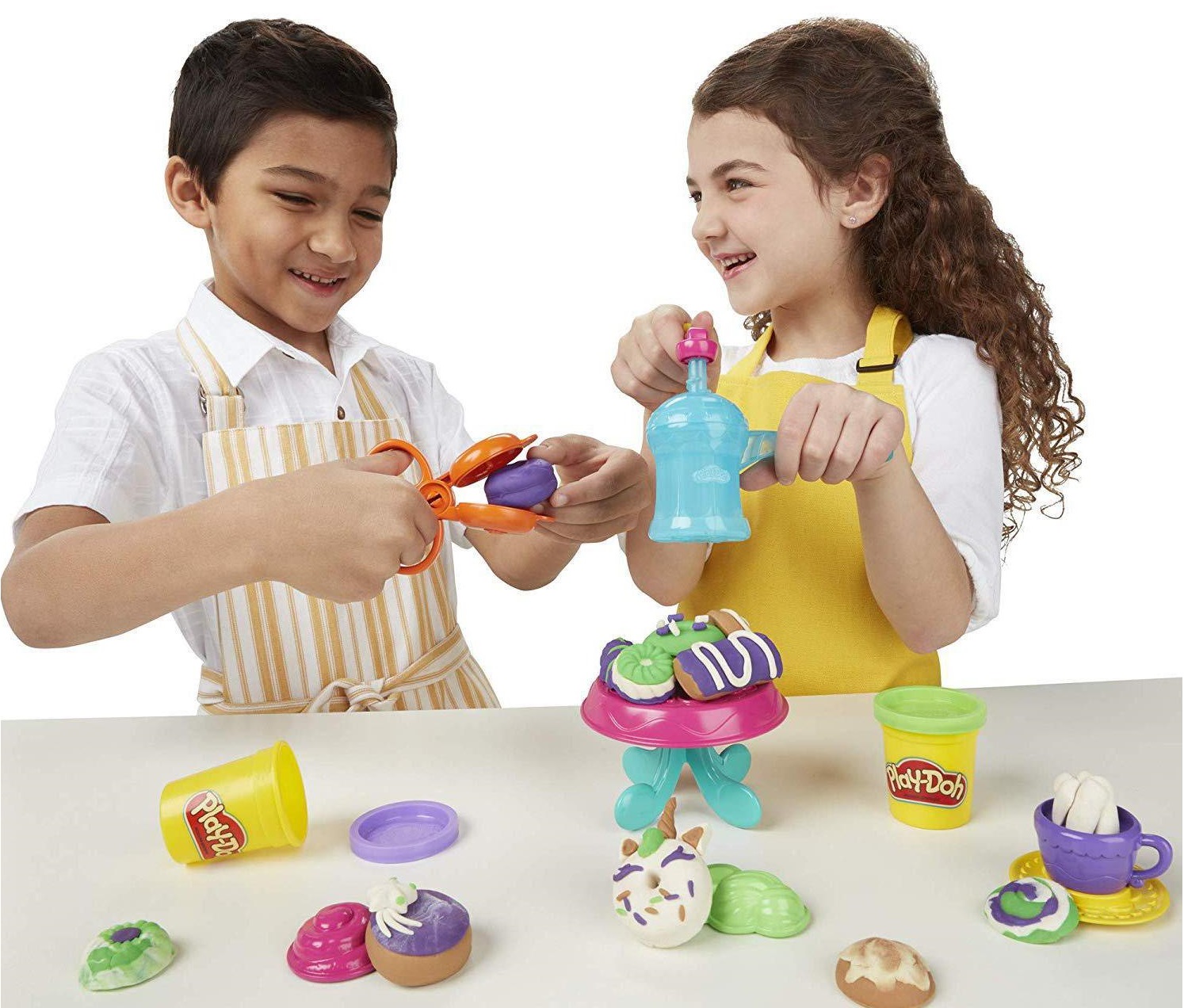 Perfekt für kleine Zauberbäcker. Mit dem süssen Set Bunte Donuts von Play-Doh entstehen die verrücktesten Knetdonuts. Vier Förmchen und eine Schere bringen die Donuts in Form, die Knetspritze setzt der Leckerei das Sahnehäubchen auf und aus der Kurbel kommen kleine Streusel heraus.