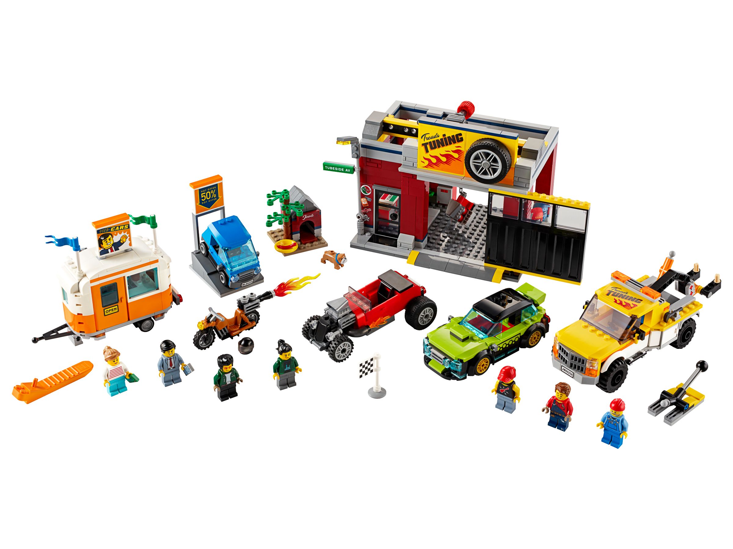 - Zum Set gehören eine Werkstatt, ein Wohnwagen und coole Fahrzeuge, etwa ein Abschleppwagen, ein Hot Rod und ein Motorrad mit Raketenantrieb, sowie 7 Minifiguren, darunter auch die Charaktere Tread Octane und Harl Hubbs aus der LEGO® City TV-Serie.