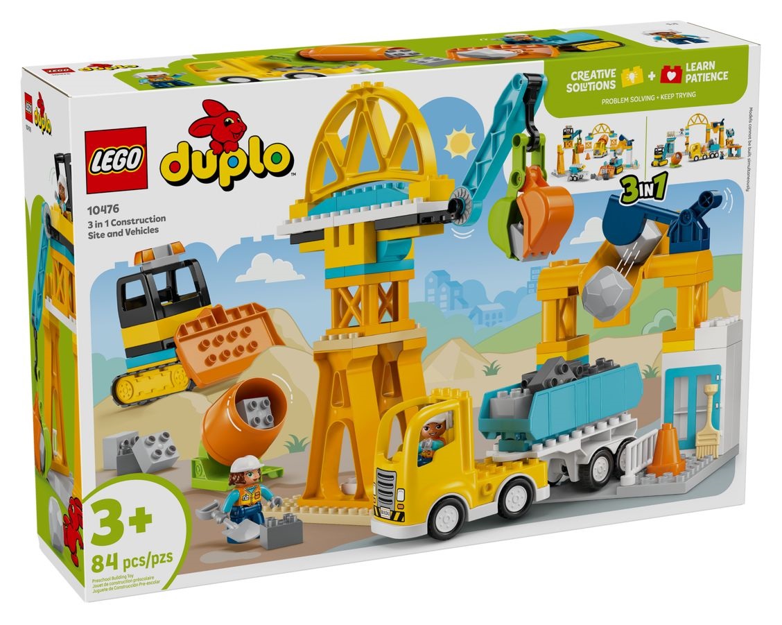GROSSES BAUSPIELZEUG FÜR KLEINKINDER: Baustelle mit Baufahrzeugen – 3-in-1-Set (10476) beinhaltet 2 Figuren und 84 Bausteine, um viele LEGO® DUPLO® Town Baufahrzeuge und Bauwerke erschaffen zu können