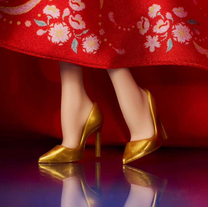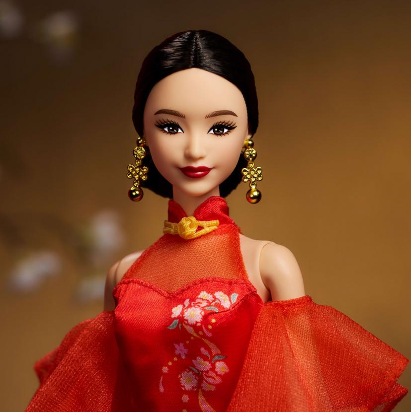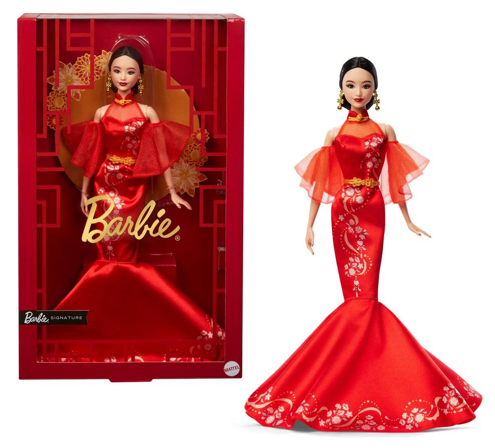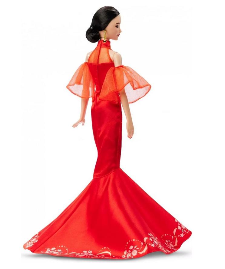 Feiere das Mondneujahr mit der Barbie-Puppe. Strahlend in glücklichem Rot trägt sie ein typisches Qipao, das mit einer modernen Meerjungfrau-Silhouette, einem traditionellen Mandarin-Kragen und transparenten Glockenärmeln gestaltet ist, die wehen, während sie zu einem festlichen Löwentanz klatscht. Meihua-Pflaumenblüten schmücken das Kleid und symbolisieren Stärke und Widerstandsfähigkeit. Um ihren Look zu vervollständigen, trägt sie goldene Ohrringe und einen Gürtel mit glücklichen chinesischen Knotendesigns. Möge deine Mondneujahr-Barbie deine Feiertage mit Freude, Fülle und Glück segnen. Die Puppe kann nicht allein stehen. Farben und Dekorationen können variieren.
